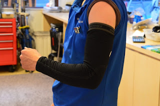 気温差が激しいのでレッグウォーマーやアームウォーマーなど