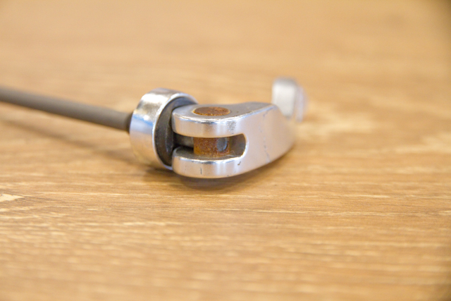 とある日、全体チェック作業をしていたときにクイックリリースが開かない車体を見つけました。固定状態で固着してしまっていたのです。なんとか開いて取り外せたのがコチラ。