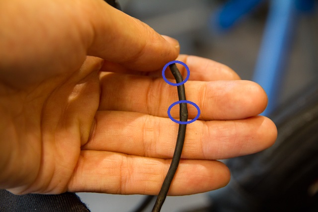状況確認からピンと来たので、一本のエレクトリックワイヤーの状態を確認してみました。すると、2か所(青丸)でワイヤーが押しつぶされたような跡がありますね。ここが原因かもしれないという仮説を実証することにしました。