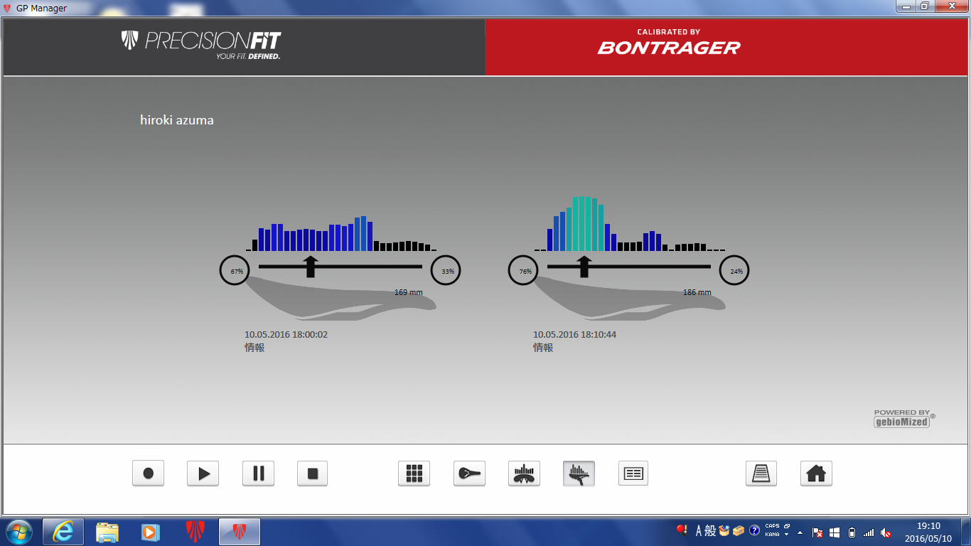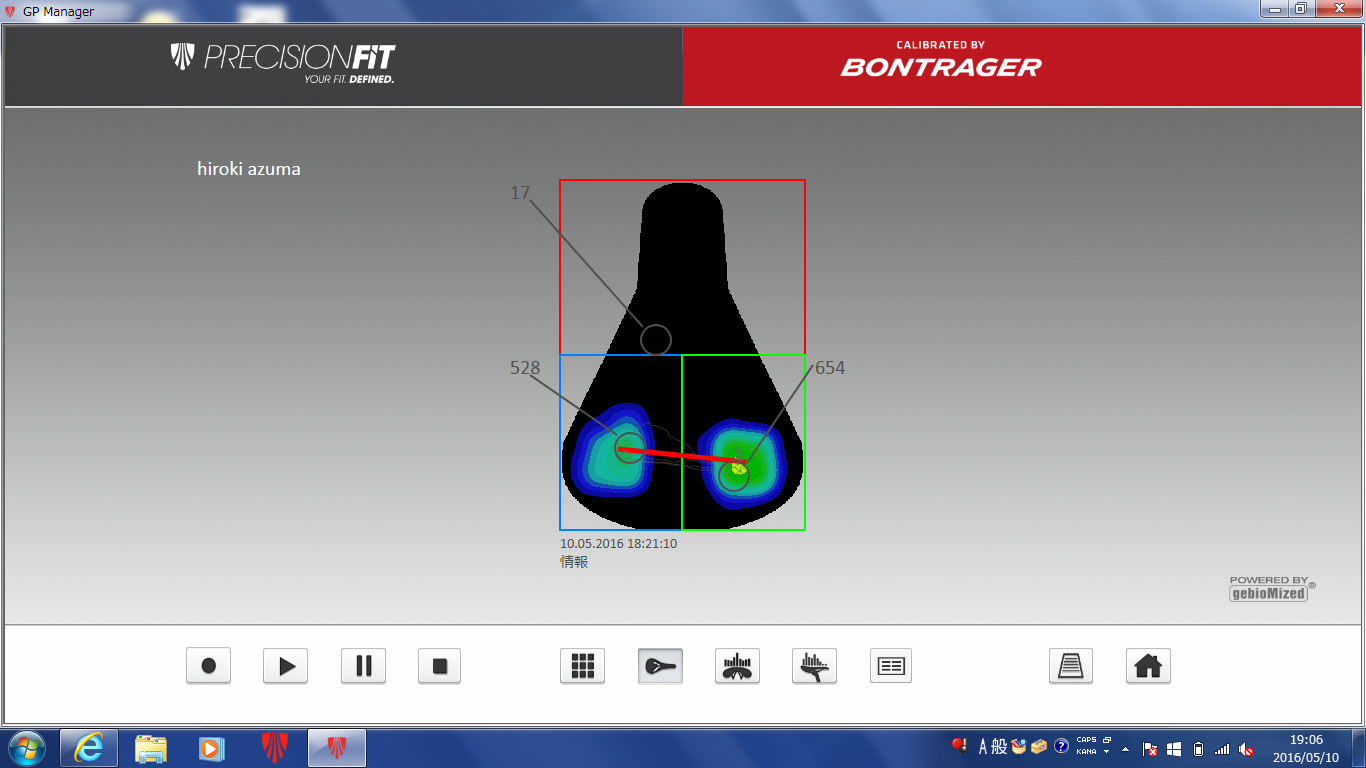 沖山曰く、圧力数値自体はそんなに高いものではないそうです(軽量な人なら100ミリバール台、重量級の人は600~700ミリバールに及ぶこともあるとか) そう考えると、体重は軽量ではない僕における数値としては比較的低めということが分かります。また、赤線が右上がりにずれていますが、これはペダリングに関する癖が見えてきます。僕は以前から左足のペダリングが右足に比べると強いことが分かっています。左脚に対して、右足が同じような力でペダリングできずに、重心点が左にずれていることを読み取れるのは非常に興味深いですね。