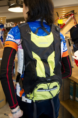 今回はU-10という、昨年モデルチェンジしたオフロード向けバッグの新色・ライムイエロー。女性が背負うとこんなイメージ。身長168cmの私の場合、底辺が腰あたりまできます。せっかくなのでサイクルジャージを着て擦れや食い込みも体感しました。うん、MTBにまたがった感じですでにフィット感高いですね。