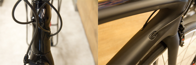 現行Domaneは独特な配線パターンとなっていて、ヘッドチューブから全てのケーブルを挿入するスタイルでした。一方Domane SLRはEmondaと同様に、ブレーキはトップチューブから、シフトはダウンチューブから取回すルートとなっています。日本人ライダーに多い、「左:後ろブレーキ」の取り回しはDomane SLRのほうが美しく、機能的に取り回しできるようになったと感じています。