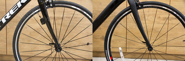 そして最後は最も大きい変更点となります!Domaneの特徴として最も注目される「ISO SPEEDフォーク」最近のロードバイクには珍しいフォークレッグが湾曲している「ベントフォーク」が若干変わっています。中でも変更されている点はホイールハブとの接触面「フォークエンド」現行ドマーネは大きく湾曲して垂直方向にエンドを向けているのですが、Domane SLRはその点が自然なラインに変わっています。このスウィープ調整は、衝撃吸収性をUPさせる目的ということですが、エンド処理の変更により、コーナリングのルーズな感じも解消されたのではないかな?と思います。
