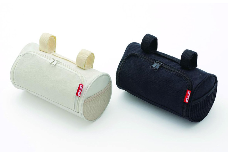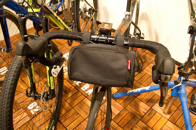 ハンドルバーに取り付けた時はこんな感じ、俵型のバッグで見た目もそんなに悪くありません。また、ハンドルバーにベルクロでクリップしているだけですので、取り外しも楽に行えます。