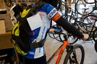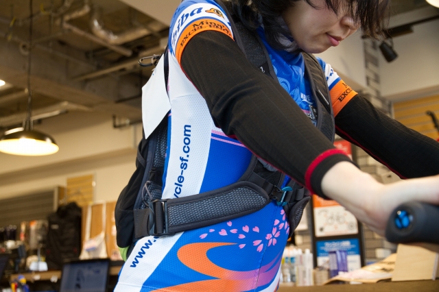 今回はU-10という、昨年モデルチェンジしたオフロード向けバッグの新色・ライムイエロー。女性が背負うとこんなイメージ。身長168cmの私の場合、底辺が腰あたりまできます。せっかくなのでサイクルジャージを着て擦れや食い込みも体感しました。うん、MTBにまたがった感じですでにフィット感高いですね。
