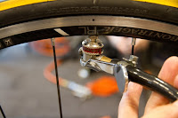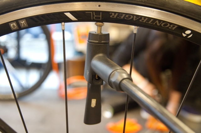 バルブからポンプヘッドを引き抜くとき、バルブ先端が曲がらないように気を遣いつつ手をあてがって・・・スポークに指が激突(T_T)スポーツバイクあるあるですよね~。