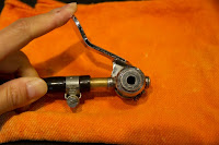 写真ではバルブ本体の出しろ(赤い部分)約10mm。ロック機構に使われているパッキンがバルブをがっちりホールド!右の写真はわざと抜くほうへ力を入れているのですが、ヘッドより先にバイクが持ち上がりそうなくらいホールドされています。