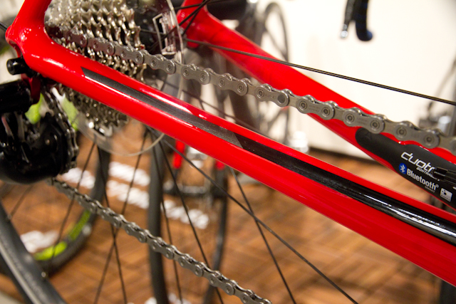 プロダクトロゴやUCI認定ロゴはこれまで通りダウンチューブ下部にまとめてあります。OCLV500ロゴが示すとおり、軽量さと力強い走りにこたえる応答性の高いフレーム特性を備えています。