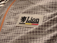 左胸にはLionロゴのプレート(柔らかい素材です)、ファスナー部はネオンオレンジカラーが配されています。千鳥模様もホワイト/ブラックカラー共にグレー基調なので、優しい印象です。襟の高さは約6cmと、首もとの日焼け防止にも一役買ってくれそうです。