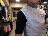 サイドのグレー部が伸縮性のある素材なので、前傾姿勢を取ってもツッパリ感はなし。ゆとりを感じるので、私くらいの身長の方はSサイズも着用できそうです。腕ぐりは伸縮するようギャザーが施されており、風を受けてもバタつきにくい工夫が見えます。