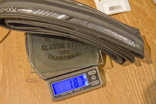 タイヤ1本の重量はボントレガーに軍配が上がりました。その差は35グラム。タイヤ1本200グラム中の割合は2割弱というところで、侮れない重量差です。実はボントレガーのクリンチャータイヤ(Rシリーズ)は価格帯別/サイズ別で最軽量になる事が多いです。