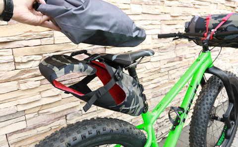 別記事でご紹介の「ハンドルバーロール&ドライバッグ」と併せての装着例です。