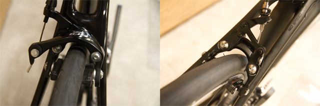 まずはブレーキ。今回はキャリパーブレーキモデル同士での比較となります。現行Domaneはデュアルピボット方式のシングルボルトオンブレーキ(=これまでのノーマルタイプ)で取り付けしていましたが、Domane SLRは新規格となるダイレクトマウント方式に変更されました。この方式は2本のボルトでブレーキをフレームに固定する事でブレーキ制動力をUPさせ、さらに軽量化につながるというメリットが多いもの。写真のブレーキはBontrager製のものですが、SHIMANO Dura-Ace / ULTEGRA / 105モデルのダイレクトマウントブレーキも用意されています。