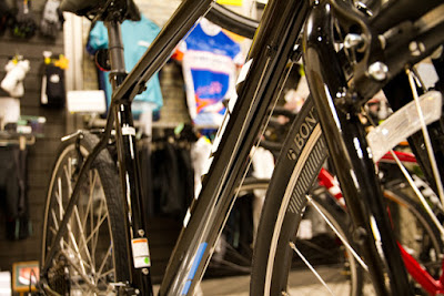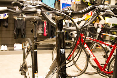 車体の前面部です。ヘッドチューブがFX3(7.4FX)と比較すると、大分細いですねー。クラシカルなつくりで、上下同サイズのベアリングを採用しています。最近のクロスバイクは、最新テクノロジーが満載で、カーボンロードバイクにヘッドチューブ周りは似てきていますが、どこか懐かしいこのシルエットは肩肘貼ってない感じが良いですね!また、フロントフォークはクロモリ製という構成になっています。(ここが重量増の原因?)