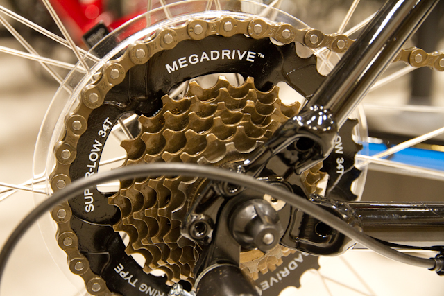 リアのギアセットは見慣れないですね~。MEGADRIVEと表記されたローギアは、セカンドギアと比較すると2周りほど大きい歯がついています。上り坂などには強い味方になりそうです!ちなみにこのギアセットは「ボスフリー」タイプのギアセットで、アップグレードは正直難しいので、将来的に快適度UPのためのアップグレードをお考えの方はFX2の購入がオススメ!