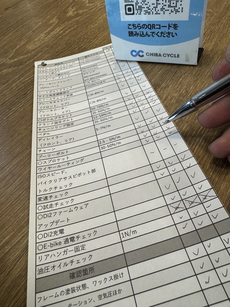 ちばサイクルで納品となる車体は整備技士資格をもつスタッフ2名による最終チェックがあり、合格後には試乗チェックを行います。
