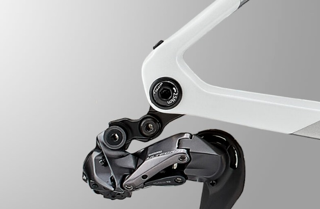 UDH (ユニバーサルディレーラーハンガー)は、他メーカーも含めてハンガー(後変速機とフレームの間にある部品で後変速機をぶつけたりしたときに、このパーツが傷むことにより後変速機やフレームを守る)の規格を同じにしよう、ということで作られたもの。負荷がかかったとき少し動き、ハンガー自体も衝撃を回避することもある。チェーンがスプロケットのトップ側に外れたときのフレーム傷防止にも一役買います。