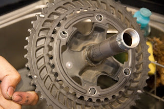 先日、オーバーホールを承った車体の内、1台を清掃していて気になる事がありました。上の写真をご覧ください。スプロケットに付いた黒い泥のような汚れがついてます。スプロケットの歯の下側と歯と歯の間にこの汚れがびっしりと…。