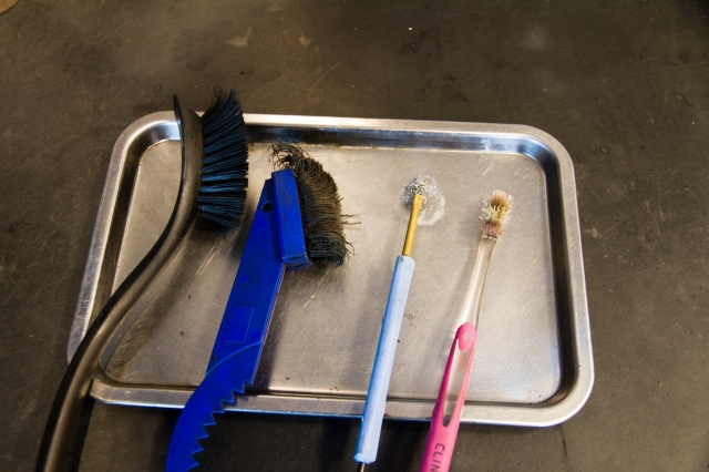 普段、オーバーホールで使用する主な清掃用具たち。大体この4種類を使って、汚れを掻きだすように落とします。(場所によっては写真に掲載していない特殊な形状をしたブラシを使用する事も)