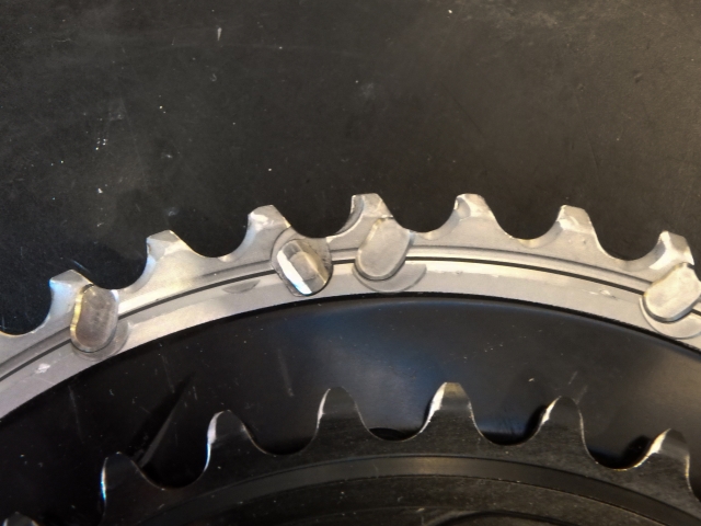 フロントチェーンリングの裏側。変速するポイントは決まっています。