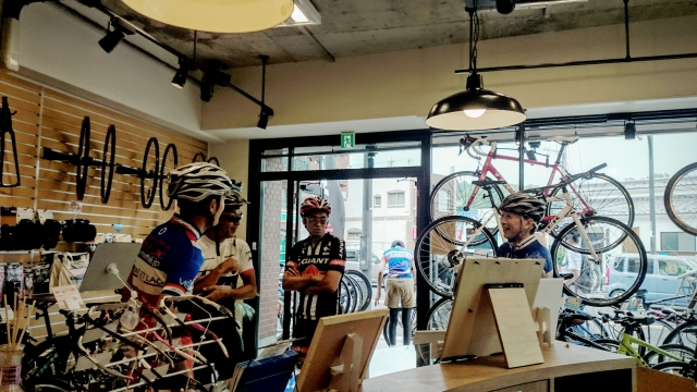 帰り途中で、常連のM様と合流!「今日のサイクリング、前日の飲み会が無ければな~」なんて話をしながら藤沢店に戻ってきました。その後も自転車談義で盛り上がる4名様!