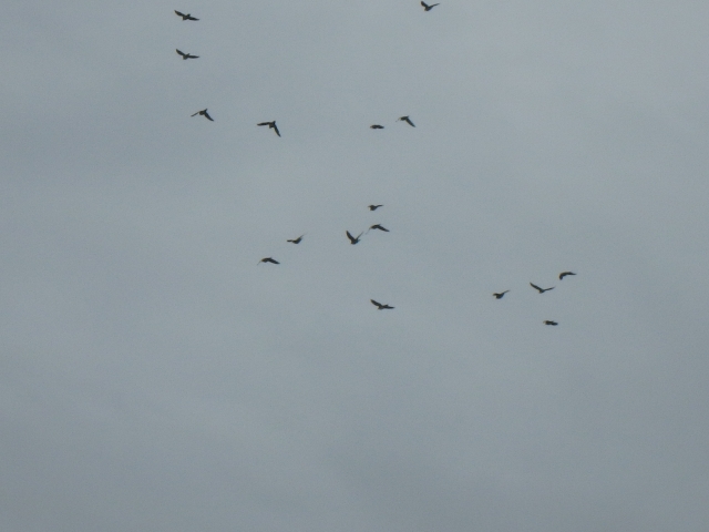 アオバトは臆病な性格らしく、海水を飲むために着地する岩礁にはわずか1分ほどしかいません。群れで移動する性格らしく、休息地となっている近所の森から岩礁へは写真のように数十羽が一斉にやってきます。