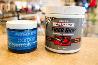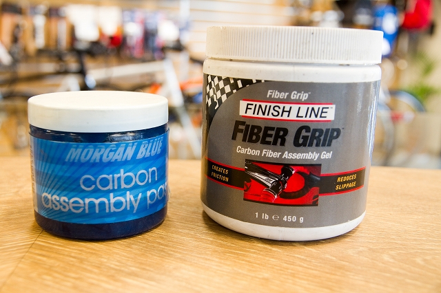 そこで、固定力を増すためのアイテムがこちら。一般的には「カーボンペースト」と呼ばれています。これはグリスのような粘度をもったベース剤に、スクラブのような粒粒を混ぜ込んだもので、カーボンパーツ同士を締め付けた時の食いつきをよくするためのもの。