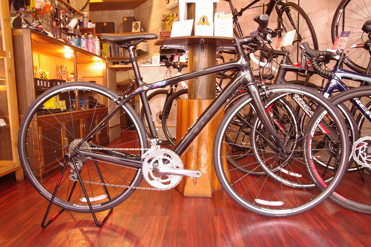 こちらはフルカーボンモデルのクロスバイク。実際に持ち上げてもらうとあまりの軽さにビックリするはずです。性能面でもロードバイクと遜色のないパーツ類が搭載されています。