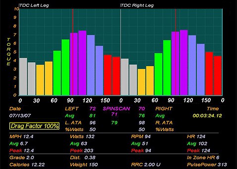 ペダリングの際に、左右のクランクがどの位置で、どのくらいの力が