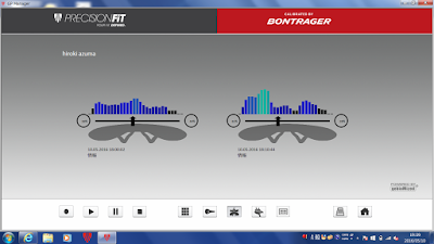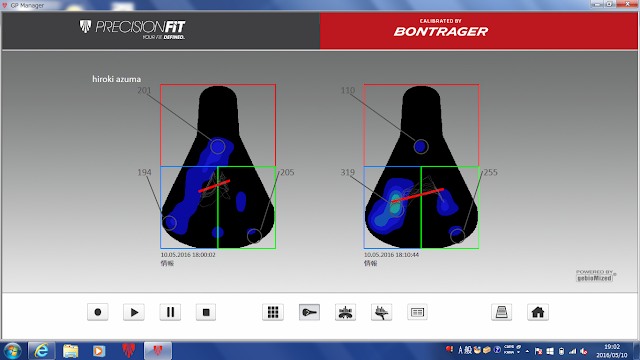 沖山曰く、圧力数値自体はそんなに高いものではないそうです(軽量な人なら100ミリバール台、重量級の人は600~700ミリバールに及ぶこともあるとか) そう考えると、体重は軽量ではない僕における数値としては比較的低めということが分かります。また、赤線が右上がりにずれていますが、これはペダリングに関する癖が見えてきます。僕は以前から左足のペダリングが右足に比べると強いことが分かっています。左脚に対して、右足が同じような力でペダリングできずに、重心点が左にずれていることを読み取れるのは非常に興味深いですね。