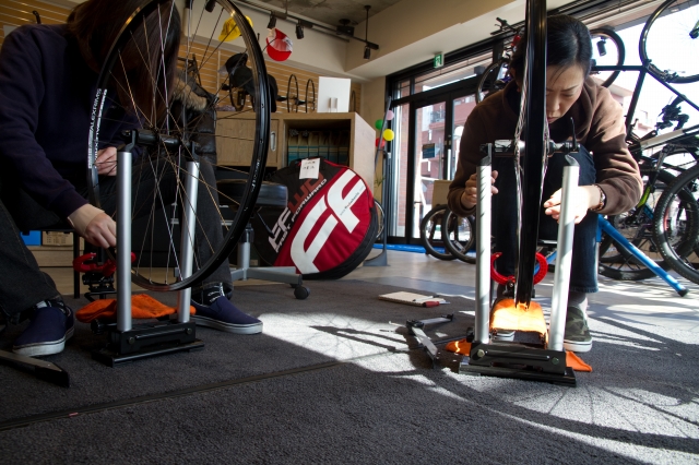 ある日の営業時間前、早めにお店に来てホイール組みの練習をしました!