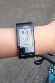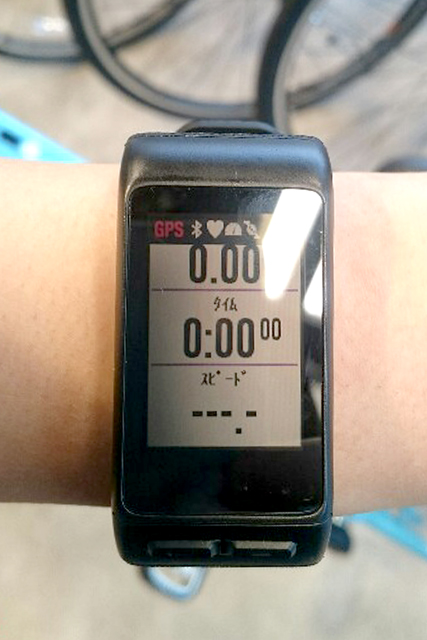 vivoactiveJを腕につけて、店舗近辺をクロスバイクの