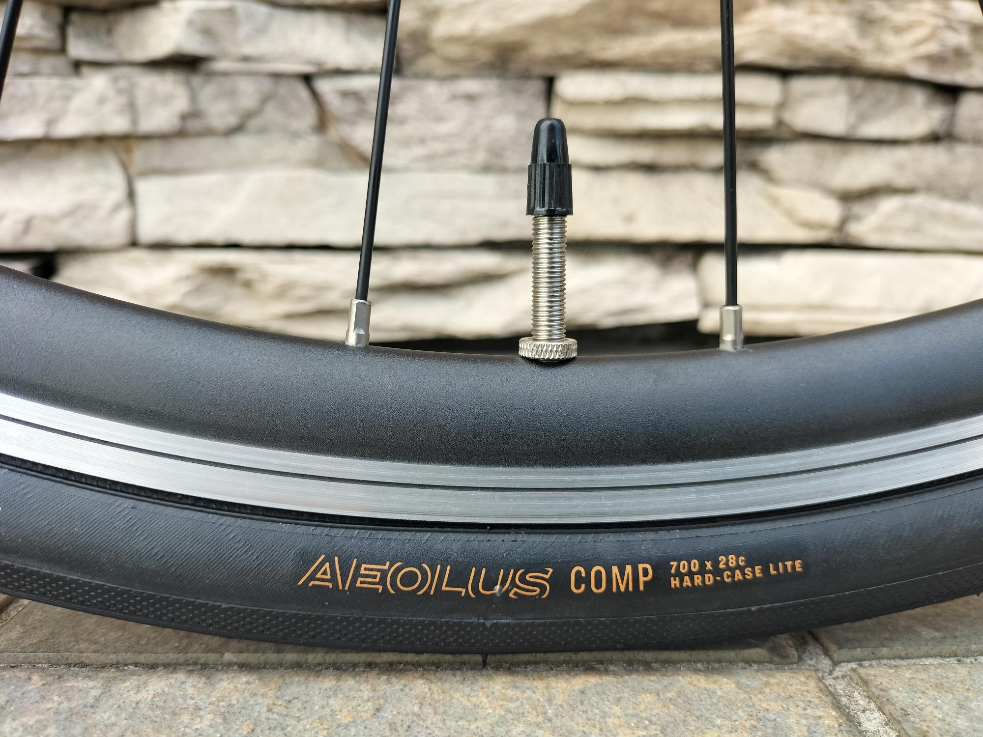 タイヤは走行中のパンクアクシデントを防ぐサブトレッドパンク防止構造の、ボントレガー Aeolus Comp(28mm幅)に交換しています。